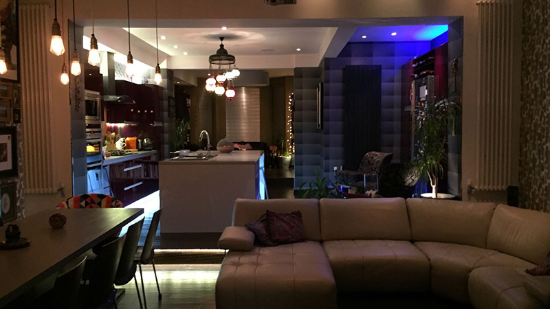 The lighting system had over 30 zones of individual lighting with on average 4 zones of lighting per room. The mixture of lighting was from recessed down lights, pendant/lamp lights where required and LED shadow lighting in warm white colour around the house and colour change in a few key areas. Externally a full garden lighting installation was installed that was controlled by the central intelligent lighting system allowing both timed, pre programmed scenes and switched control of the system. As well as a garden audio system being present in the back garden also.